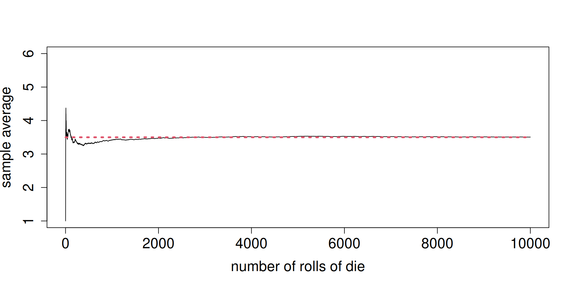 Now, roll a fair die. Let \(X\) be the outcome of one roll. Here, \(\mathbb{E}\left(X\right)=3.5\).